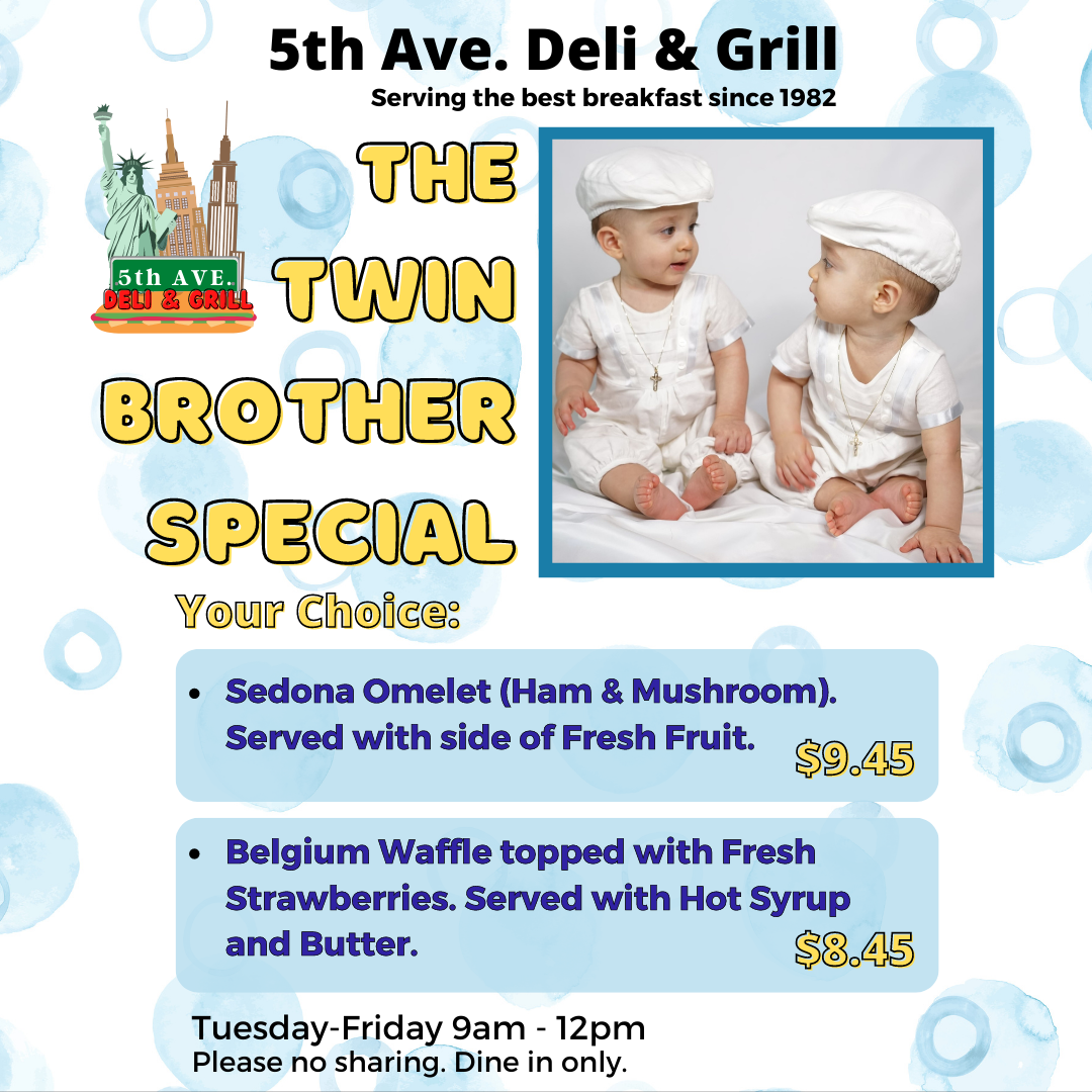Two large eggs, choice of breakfast meat, home fries or sliced tomatoes, breakfast toast and jam...Served until 11am...$6.95...Served after 11am...$8.45